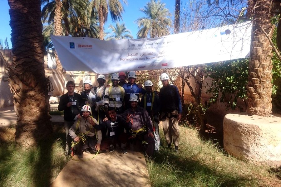 Vue de Tafilelt où nous étions hébergés. Aux portes du Sahara, cette ville a été primée en 2016 (1er prix de la ville durable ou éco-ville du désert). En fin de formation (5 jours), avec l’équipement complet : Longe corde, longe armée, harnais, casque, combi de protection. Accès à la couronne du palmier, […]