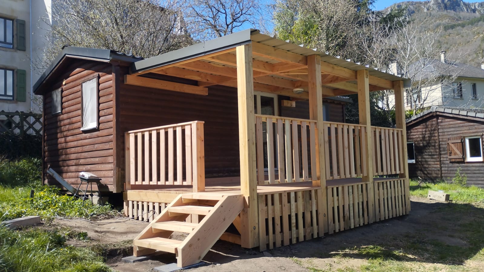 Création-construction d’une terrasse de 15m2 plancher et garde corps en douglas local, couverte en bac acier, sur vis de fondation (sans massif béton et démontable) au Camping La Molière à Vébron.